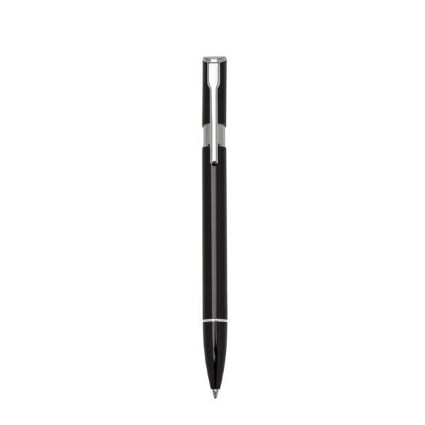 Caneta alumínio inteira colorida com detalhes prata. Possui clip de metal, parte superior e ao redor do clip detalhe prateado. Possui anel inferior prata e aciona por clique.